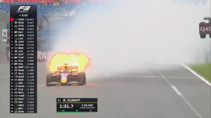 La práctica se interrumpió cuando el monoplaza del equipo MP Motorsport comenzó a largar humo y se prendió fuego en la recta principal del circuito por una falla en la unidad de potencia.