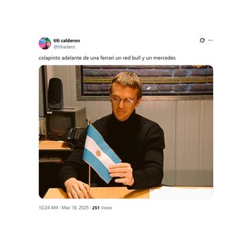 La presentación de Franco en Italia reeditó el furor que generó en 2024. Y los memes afloraron en cantidad. El hecho de que el representante albiceleste alcanzara el 8º lugar en la carrera luego del ingreso a boxes de la mitad de la parrilla. Los fanáticos pidieron en broma la finalización de la competencia para que el pilarense quedara en la zona de puntos.