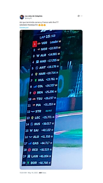 Luego, hubo quienes se enojaron con Oscar Piastri, porque superó en ese momento a Colapinto y lo relegó a la novena colocación. También hubo alusiones a la decisión del team francés de ordenarle al argentino que dejara pasar a Gasly, quien traía mejor ritmo y gomas más frescas.