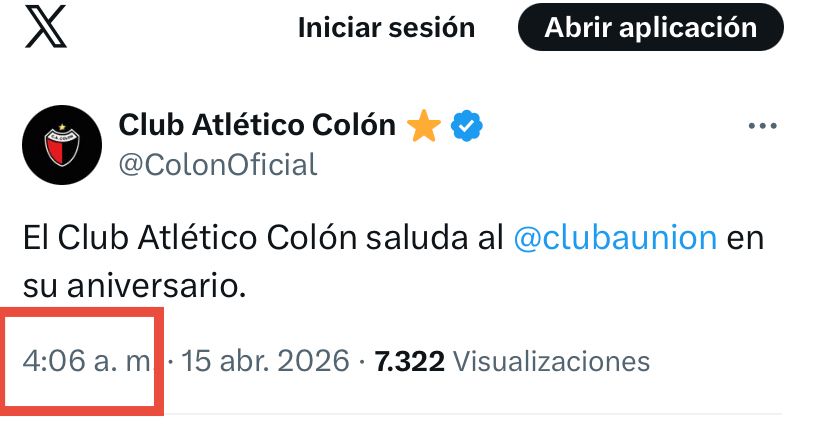 El Club Atlético Colón saludó por su 119º aniversario a Unión en redes sociales. Rápidamente los hinchas notaron un detalle en el posteo de X, el horario. La salutación fue publicada a las 4:06, ¿en alusión al campeonato?