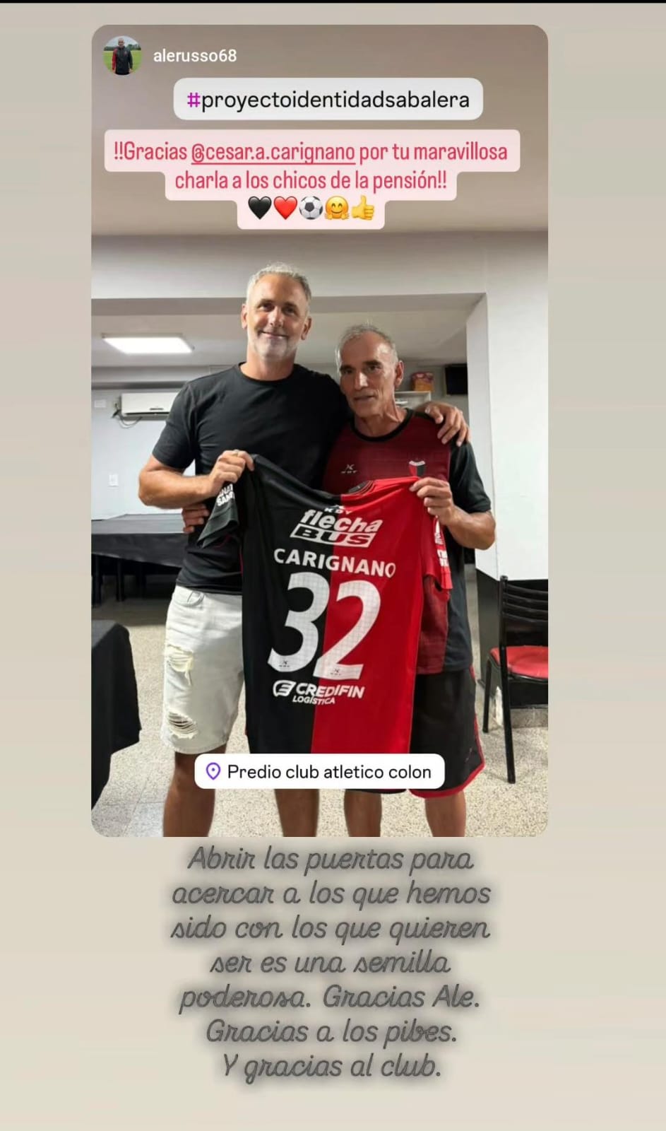 Al finalizar la misma se pudo ver en las redes sociales una foto del ex goleador de Colón junto al DT de la reserva Alejandro Russo quien le agradeció con un calido salido la charla bridada y el tiempo compartido.