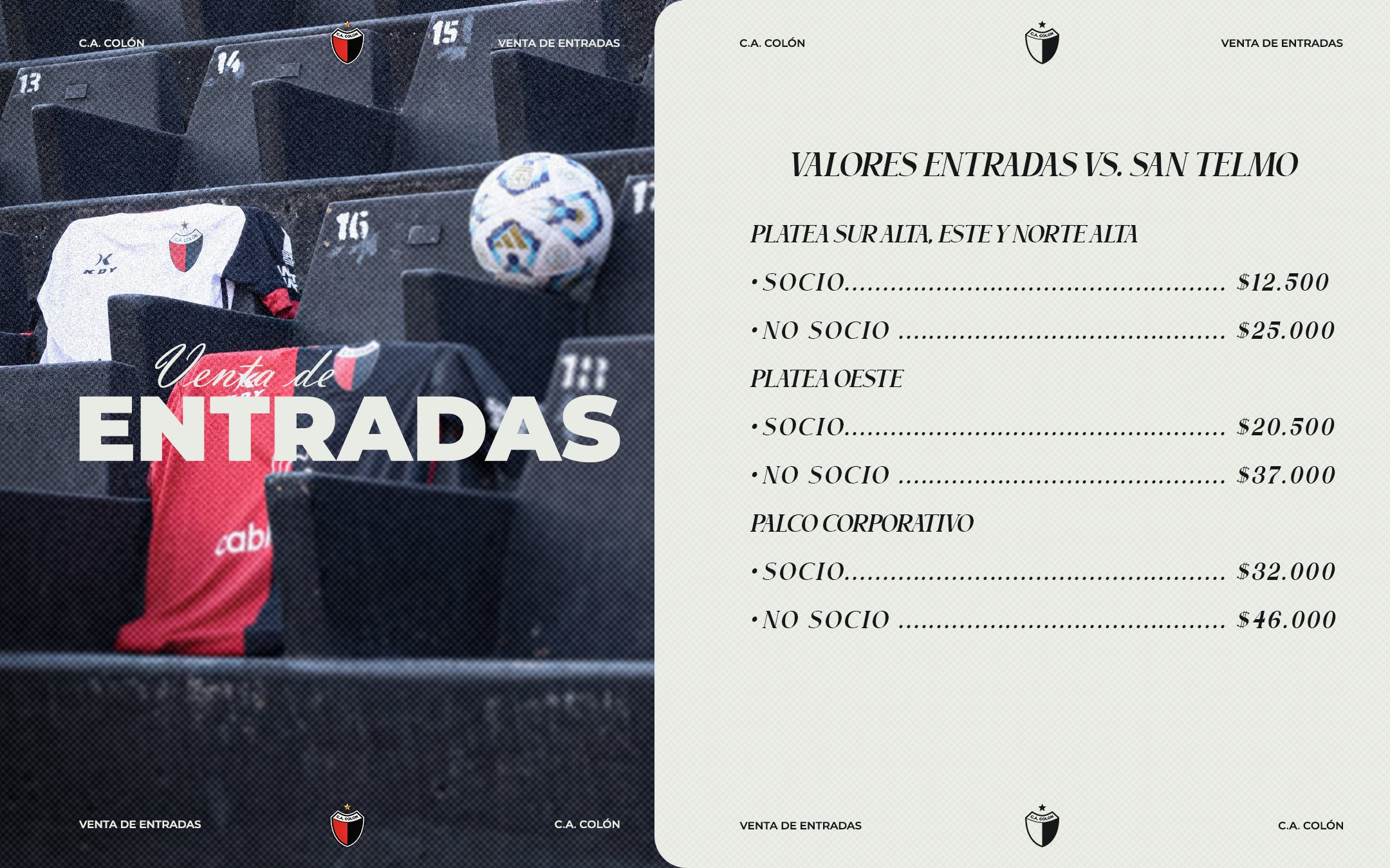 Valores: – Platea Este y Norte/Sur Alta: Socio $12.500 / No socio $25.000 – Platea Oeste: Socio $20.500 / No socio $37.000 – Palco Corporativo: Socio $32.000 / No socio $46.000