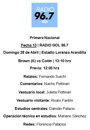 Este domingo en horas del mediodía Colón visita a Brown de Adrogué por la 13ª fecha de la Zona B del Torneo de la Primera Nacional, en busca de un triunfo que le permita mantenerse y si es posible, superar al hoy líder San Telmo, que más tarde recibe a Deportivo Madryn. Cabe recordar que el primer puesto en caso de empate en puntos, se define por diferencia de gol. San Telmo y Colón tienen ambos 25 puntos pero el Sabalero cede el liderazgo con +9 contra los +11 del equipo de la Isla Maciel.