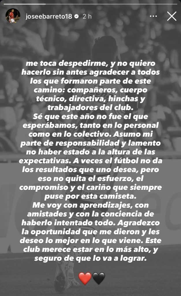 Me voy con aprendizajes, con amistades y con la conciencia de haberlo intentado todo. Agradezco la oportunidad que me dieron y les deseo lo mejor en lo que viene. Este club merece estar en lo más alto, y seguro de que lo va a lograr».