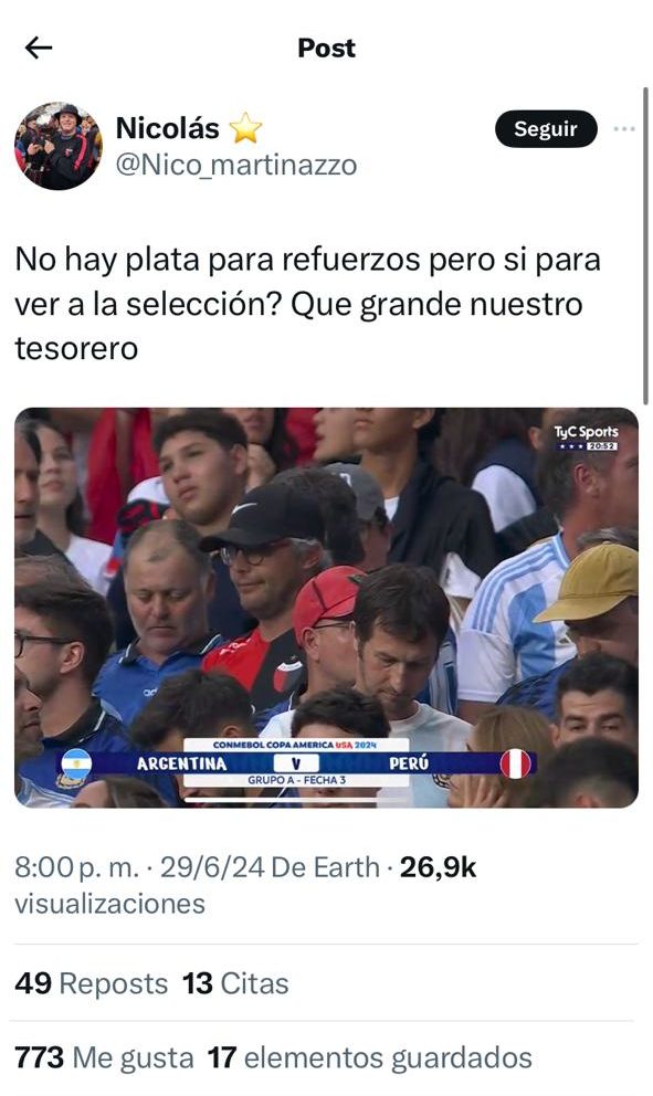 En la transmisión oficial de Argentina-Perú se pudo ver en las tribunas a Cochi Temporelli, el tesorero de Colón, alentando por la Selección en el Hard Rock Stadium. Tras viralizarse la imagen, los hinchas del Sabalero estallaron en su contra por la falta de refuerzos para el plantel de Iván Delfino en contraposición con sus rivales directos, quienes sí pudieron incorporar de cara a la recta final del campeonato. Mirá algunos de los comentarios.