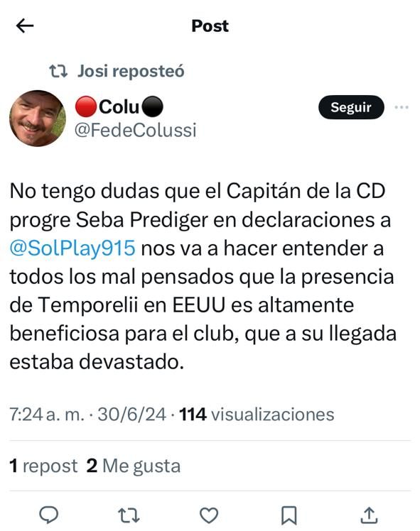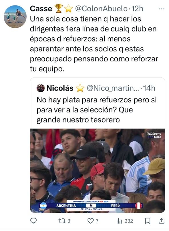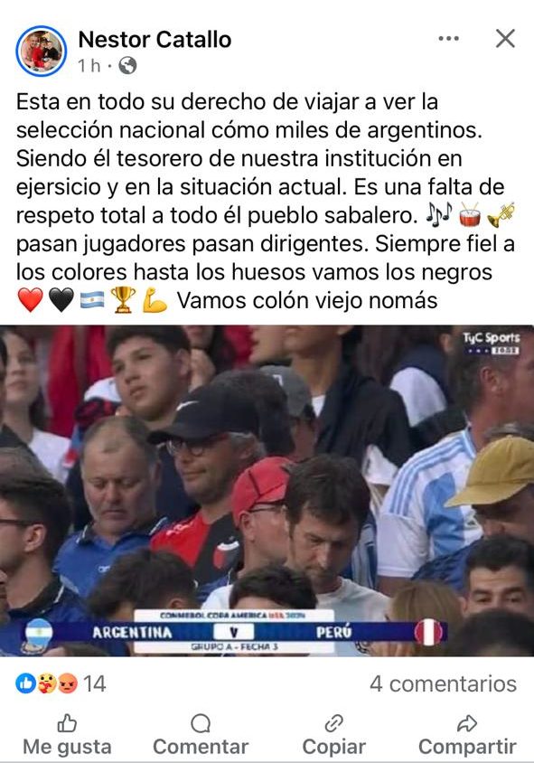 En la transmisión oficial de Argentina-Perú se pudo ver en las tribunas a Cochi Temporelli, el tesorero de Colón, alentando por la Selección en el Hard Rock Stadium. Tras viralizarse la imagen, los hinchas del Sabalero estallaron en su contra por la falta de refuerzos para el plantel de Iván Delfino en contraposición con sus rivales directos, quienes sí pudieron incorporar de cara a la recta final del campeonato. Mirá algunos de los comentarios.