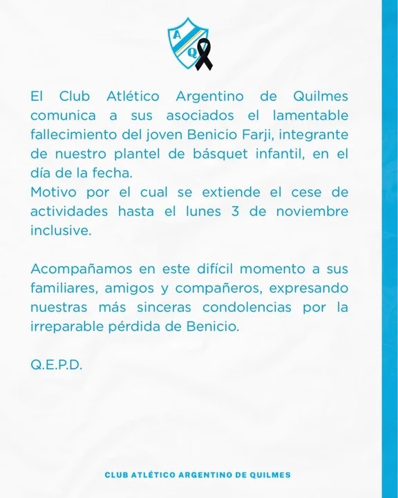 En un mensaje difundido a sus socios, el club expresó: “Acompañamos en este difícil momento a sus familiares, amigos y compañeros, expresando nuestras más sinceras condolencias por la irreparable pérdida de Benicio Farji. Q.E.P.D.” Además, informaron que, en señal de duelo, todas las actividades quedaron suspendidas hasta el lunes 3 de noviembre inclusive.