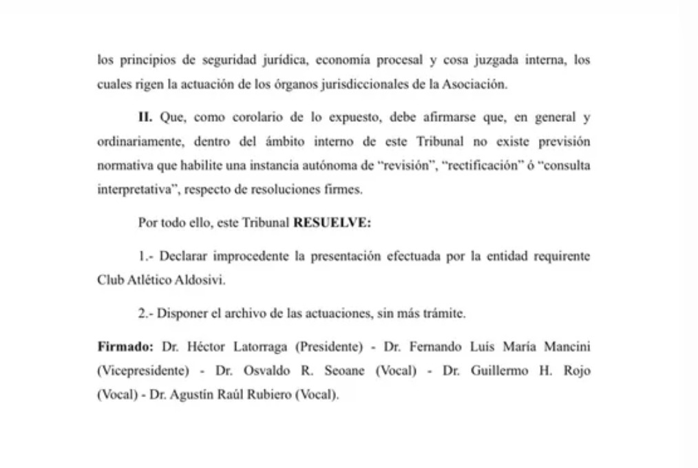 Según explica el fallo al que pudo acceder Doble Amarilla, con fecha de este 10 de noviembre, el Tribunal declaró improcedente la presentación efectuada por Aldosivi y dispuso el archivo de la causa.
