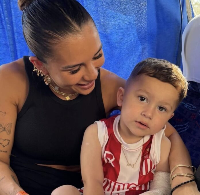 La esposa de Facundo Farías, Angie Olivera, posteó fotos posando con la camiseta de Estudiantes junto a su hijo en la antesala a la final entre Racing y el Pincha.