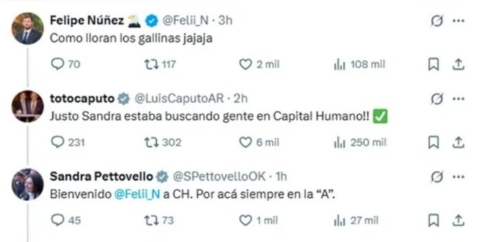 En este contexto, Felipe Núñez, integrante del equipo ecónomico de Milei, tuiteó en la red social X: “Como lloran las gallinas jajaja”. Quien recogió el guante fue el ministro de Economía que le contestó: “Justo Sandra (Pettovello) estaba buscando gente en Capital Humano!!”