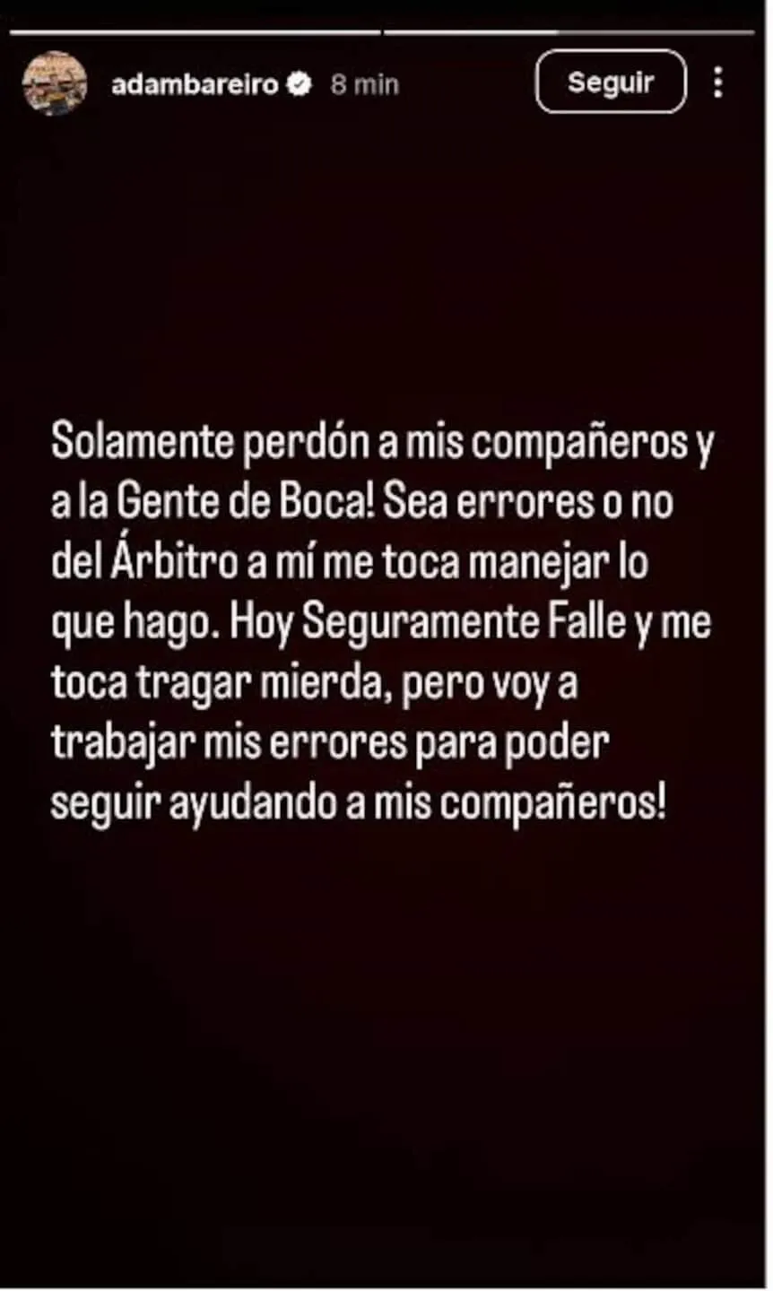 «Solamente perdón a mis compañeros y a la gente de Boca. Sean errores o no del árbitro, a mí me toca manejar lo que hago», escribió el delantero. Bareiro, que venía siendo uno de los titulares del ciclo de Claudio Úbeda con seis goles en 13 partidos, no ocultó su frustración: «Hoy seguramente fallé y me toca tragar mierda, pero voy a trabajar mis errores».