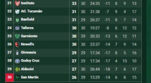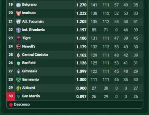 San Martín de San Juan, con 26 puntos, quedó en el fondo pero como estaría descendiendo por los promedios no hay que contarlo y en este momento habría un desempate entre Aldosivi (27) y Godoy Cruz (27). No se toma en cuenta la diferencia de gol.