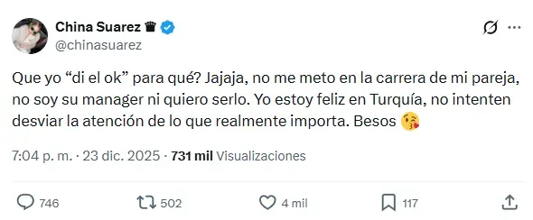 Varias versiones aseguraban que la China, confesa fanática del Millonario, habría dado luz verde a un retorno a Argentina para que el goleador se ponga la banda roja. Por ese motivo, la actriz salió a desmentir los rumores en su cuenta oficial de X, donde cuenta con más de 3 millones de seguidores.