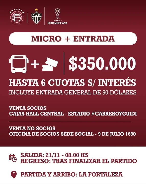 Además, el ‘Granate’ puso a la venta vuelos charters y micros para sus hinchas y socios. En lo que va de la venta, se informó que ya hay 60 colectivos completos y 15 aviones. Esto, sin contar el público que irá por su propia cuenta al vecino país.