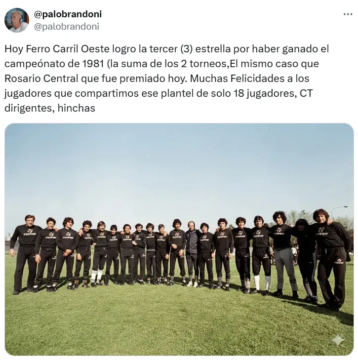 “Hoy Ferro Carril Oeste logro la tercera estrella por haber ganado el campeonato de 1981 (la suma de los 2 torneos). El mismo caso que Rosario Central que fue premiado hoy. Muchas Felicidades a los jugadores que compartimos ese plantel de solo 18 jugadores, cuerpo técnico, dirigentes, hinchas…”, escribió en X.