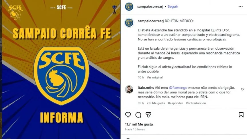 En lo deportivo, Flamengo goleó 7-1 y avanzó a los cuartos de final del torneo. Sin embargo, el resultado quedó en un segundo plano frente a la preocupación por el estado de salud de Alexandre Souza, cuya evolución seguirá siendo monitoreada en las próximas horas.