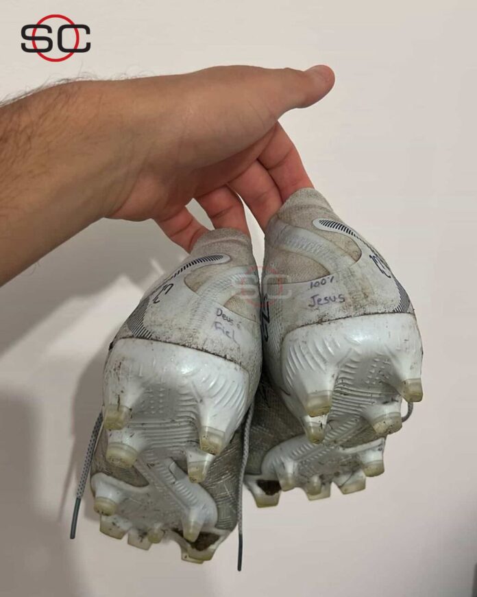 “DEUS É FIEL” en exclusivo, los botines que Neymar utilizó vs. San Lorenzo y que quedaron en manos del pibe Fabri López.