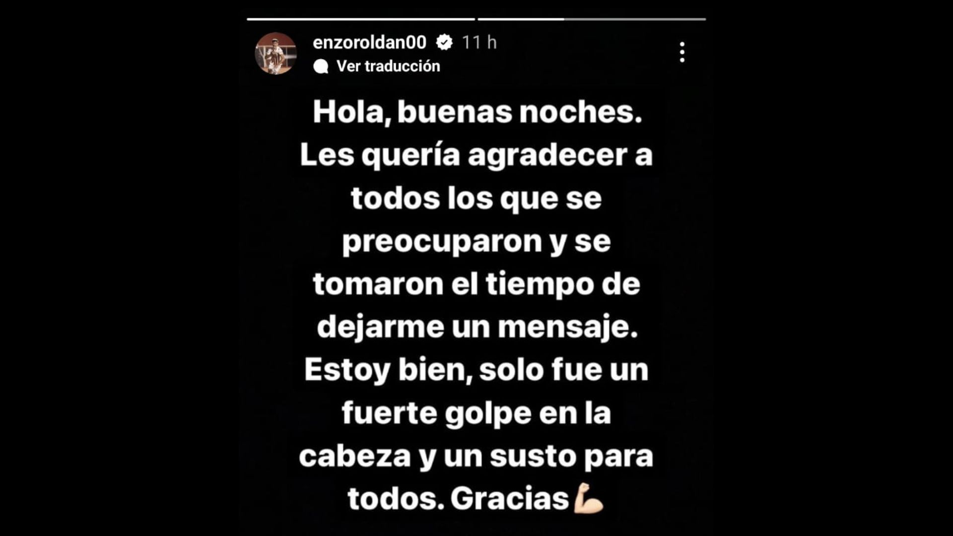 Enzo Roldán publicó en sus redes sociales: “Les quería agradecer a todos los que se preocuparon y se tomaron el tiempo de dejarme un mensaje. Estoy bien, solo fue un duro golpe en la cabeza y un susto para todos. Gracias”.