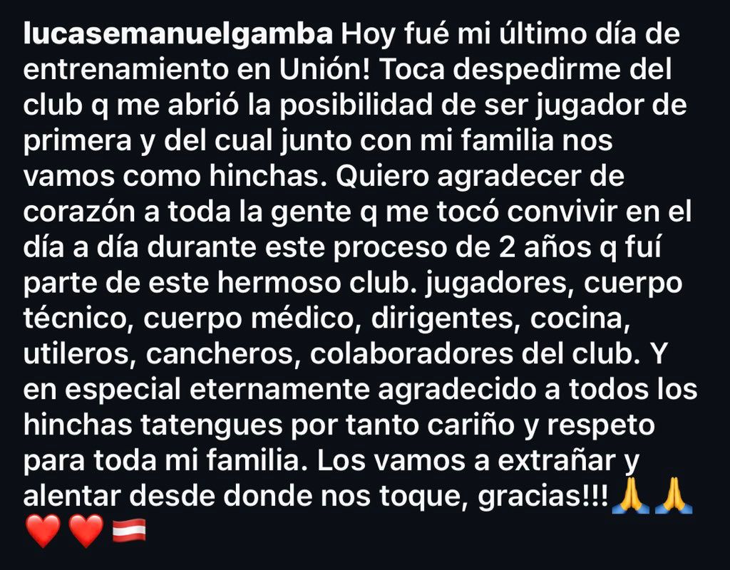 Lucas Gamba anunció su salida de Unión con una sentida publicación en sus redes sociales. El delantero confirmó, vía Instagram que este viernes fue su último día de entrenamiento en el club y aprovechó para agradecer a todas las personas con las que compartió durante sus dos años en Santa Fe.