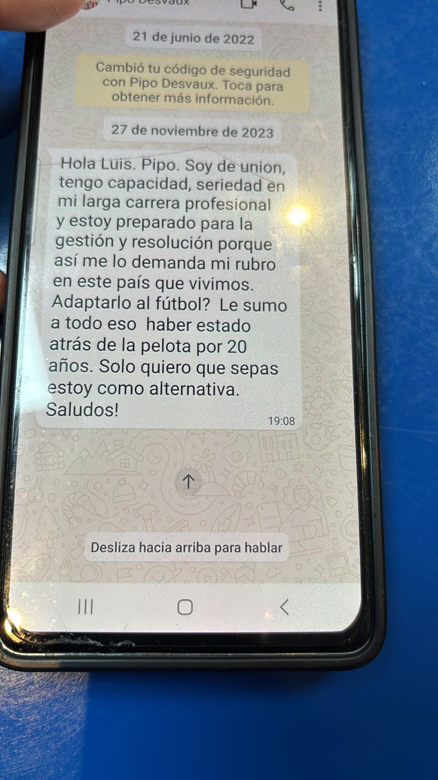 Ademas mostró chats en los cuales demuestra que el candidato a Presidente por Encuentro Unionista se ofreció en su momento para ser director deportivo durante su gestión: