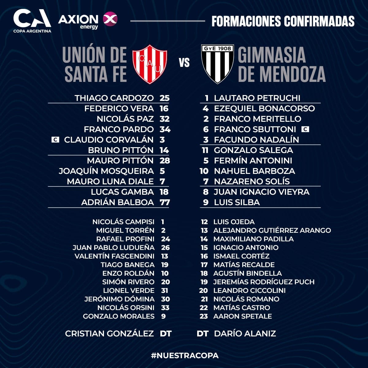 Unión: Thiago Cardozo; Federico Vega, Franco Pardo, Miguel Torrén, Claudio Corvalán, Bruno Pittón; Enzo Roldán, Joaquín Mosqueira, Mauro Luna Diale; Lucas Gamba y Adrián Balboa. DT: Cristian González.