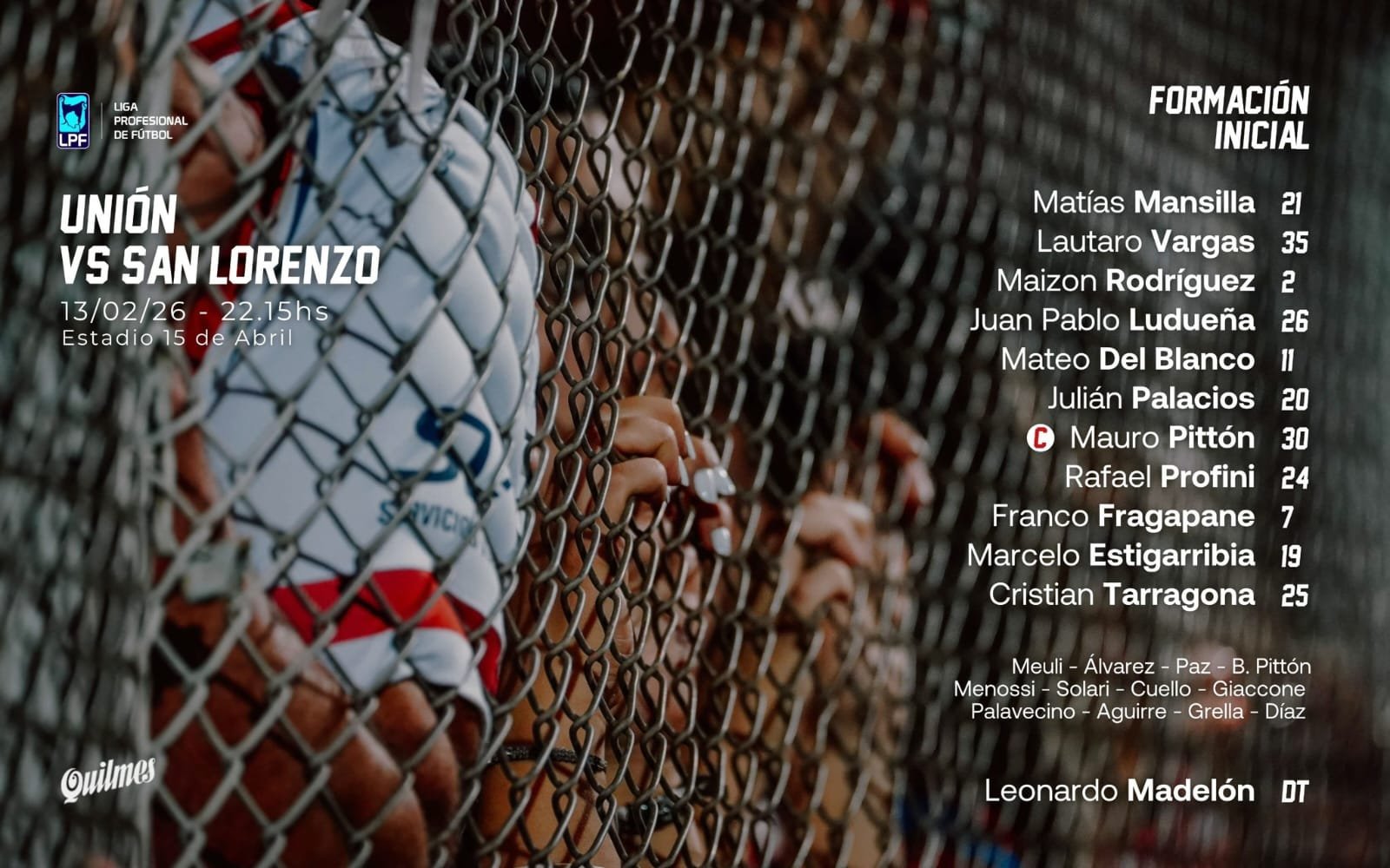 Unión: Matías Mansilla; Lautaro Vargas, Maizon Rodríguez, Juan Pablo Ludueña, Mateo Del Blanco; Julián Palacios, Rafael Profini, Mauro Pitton, Franco Fragapane; Cristian Tarragona y Marcelo Estigarribia.