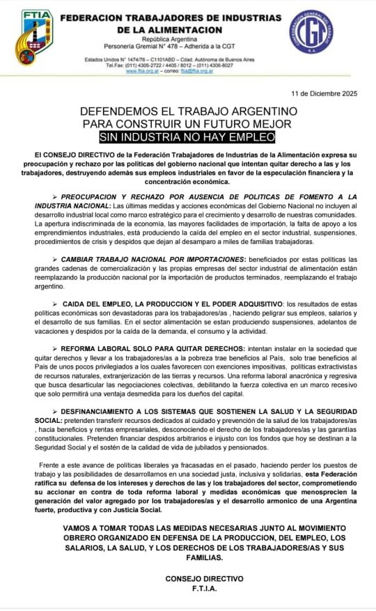 EI CONSEJO DIRECTIVO de la Federación Trabajadores de Industrias de la Alimentación expresa su preocupación y rechazo por las politicas del gobierno nacional que intentan quitar derecho a las y los trabajadores, destruyendo además sus empleos industriales en favor de la especulación financiera y la concentración económica.