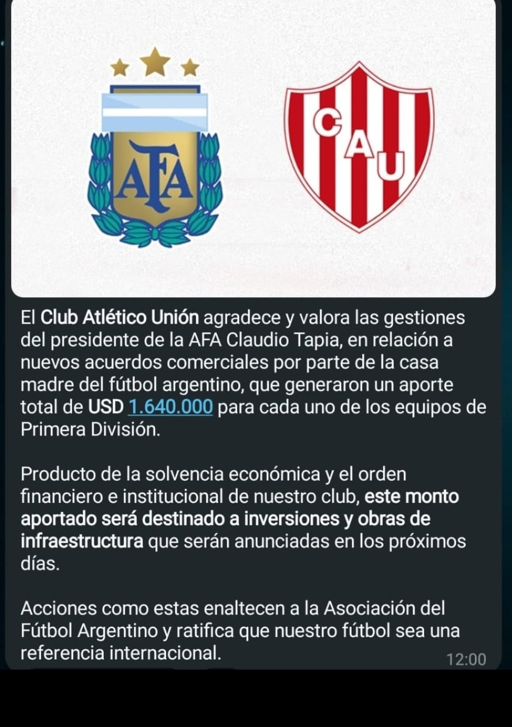 A través de sus redes sociales, Unión le agradeció a Claudio Chiqui Tapia, debido al ingreso millonario que el titular de AFA gestionó para los equipos de Primera División