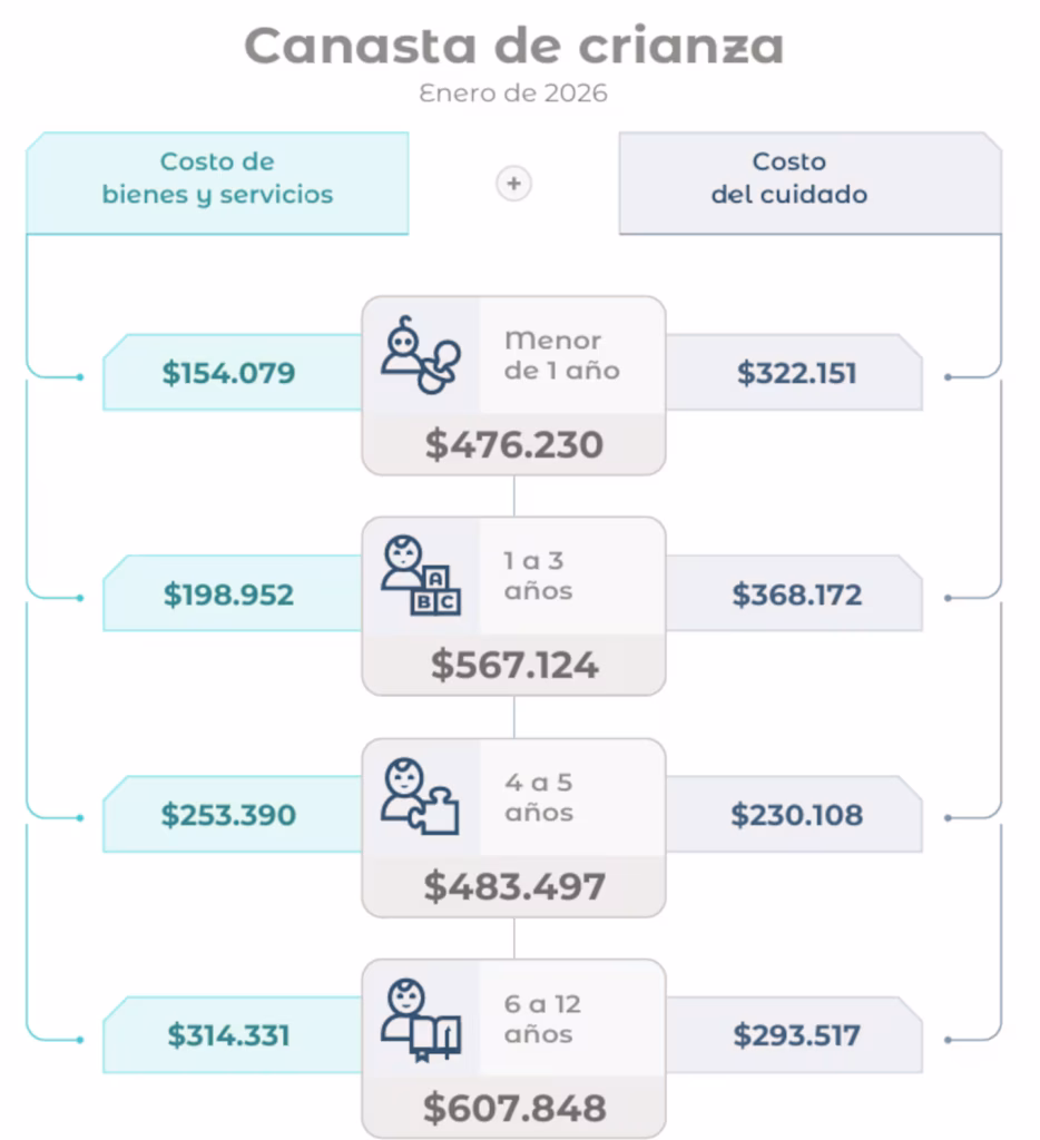 Para bebés de hasta un año, el costo fue de $476.230; para chicos de 1 a 3 años, $567.124; y para el rango de 4 a 5 años, $483.497. El indicador incluye gastos en alimentos, vestimenta, transporte, educación, salud y vivienda, además del tiempo de cuidado necesario según cada edad.