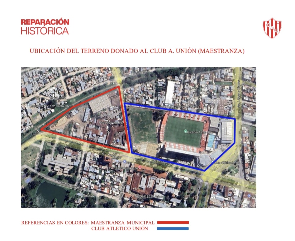 Unión busca recuperar los terrenos donados en 1967 que actualmente ocupa la Municipalidad. Según el relato, en el año 67, el intendente Ureta Cortés donó terrenos a Unión y a Colón para actividades sociales y deportivas. En el caso de Unión, los terrenos donados fueron los conocidos como Maestranza o El Corralón, ubicados en Avenida Perón. Sin embargo, en 1976, durante el gobierno militar, el intendente Coquet decidió quitarle los terrenos a Unión de forma unilateral y sin respaldo de la provincia.