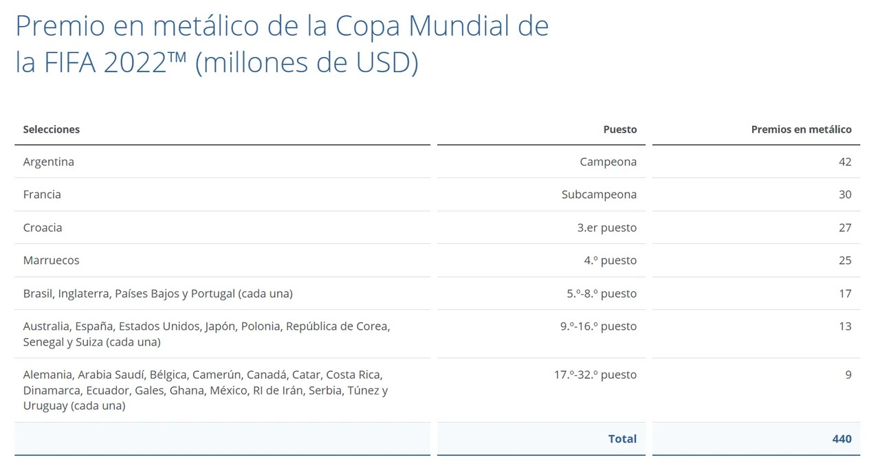 Es decir, la cifra real asciende a U$S 52 millones, muy lejos de los U$S 80 millones mencionados por Caruso. En los documentos oficiales difundidos por FIFA, como parte del informe anual 2022, dan muestra de los premios que otorgaron en el Mundial de ese año.