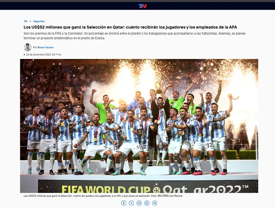 El sitio web del canal detalló que el premio total recibido por la Selección, la porción destinada a los futbolistas y al resto de la delegación y, además, explicó en su desarrollo cómo se invertiría parte del dinero restante.