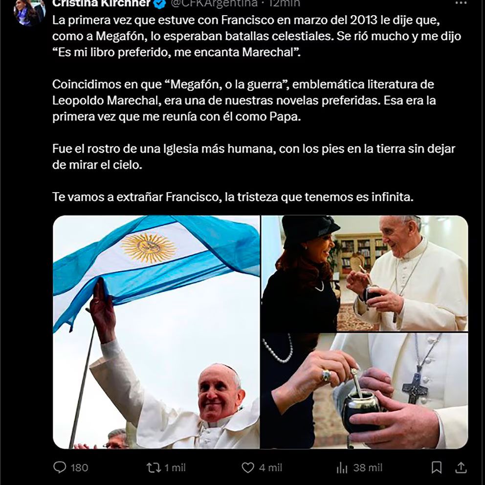 La expresidente de la Nación, Cristina Kirchner, recordó al Papa Francisco luego de la noticia de su muerte a los 88 años.