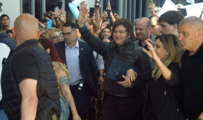 Entre que Javier Milei bajó del móvil y caminó unos pasos a toda prisa hasta las puertas de vidrio que se abren automáticamente pasaron solo unos minutos, que fueron suficientes para estrechar manos, repartir besos y ser una y otra vez fotografiado. Desde la comitiva presidencial, que lo cuidó sin mayores inconvenientes gracias al vallado, se veían solo rostros sonrientes, cánticos y pantallas de celulares. La contramarcha había quedado en la zona céntrica, lejos. Pero también allí se demoraron partidarios de Milei que con el correr de los minutos supieron del cambio de escenario para un encuentro partidario que no puede ser calificado bajo los términos tradicionales de un acto político.