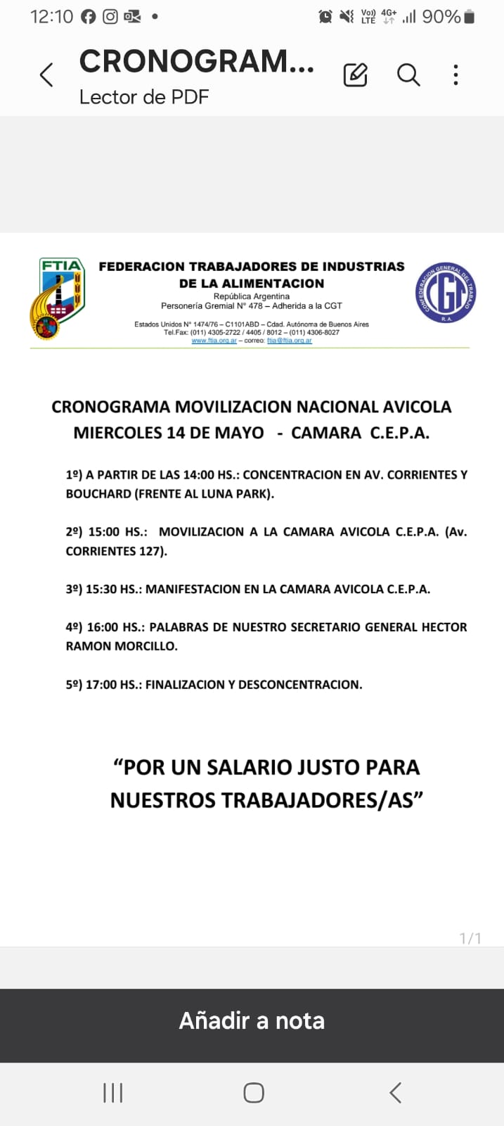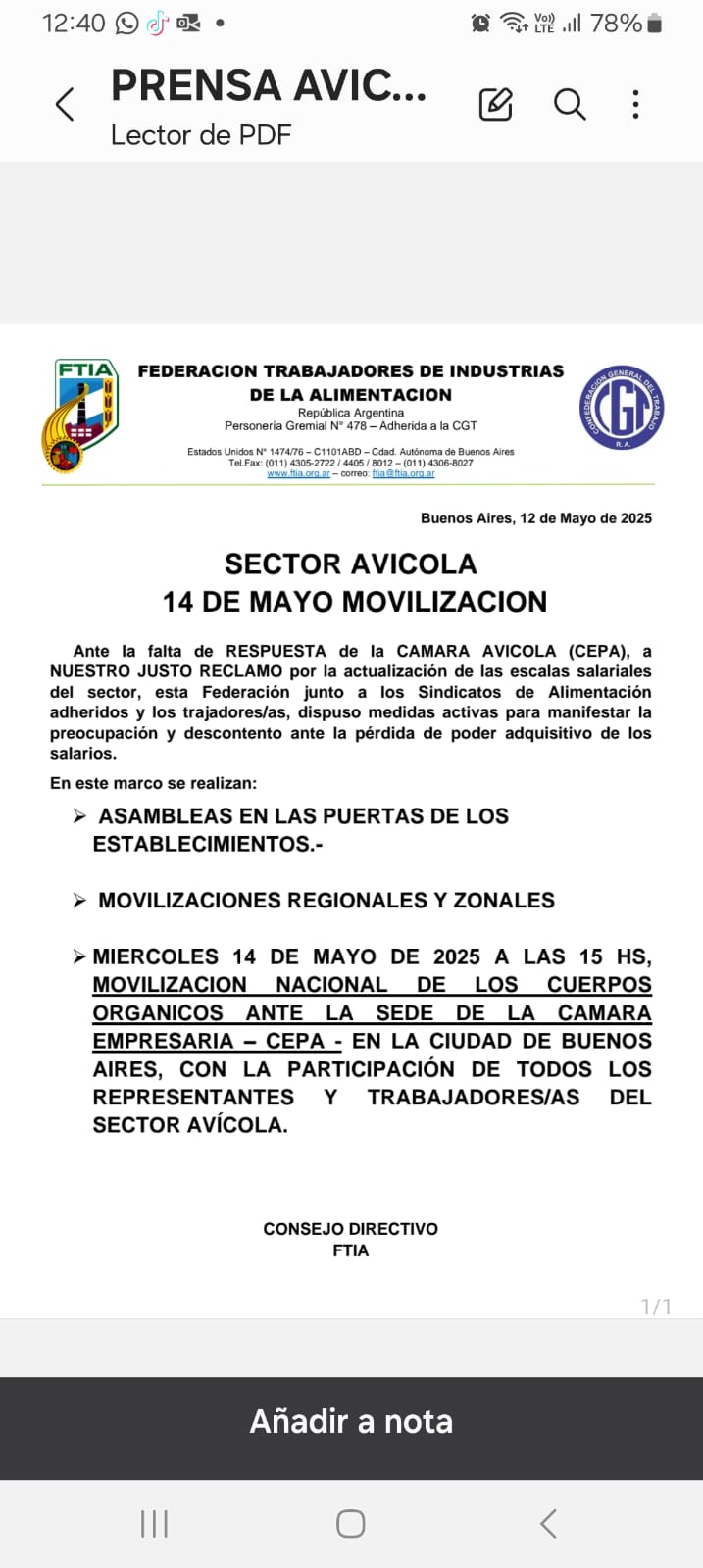 La FTIA convocó a una movilización nacional hacia la sede de la CEPA, que se realizará el miércoles 14 de mayo a las 15 horas con la participación de representantes avícolas de todo el país. Entre las medidas definidas se destacan asambleas en las puertas de los establecimientos en todo el país y movilizaciones regionales y zonales para visibilizar el conflicto.