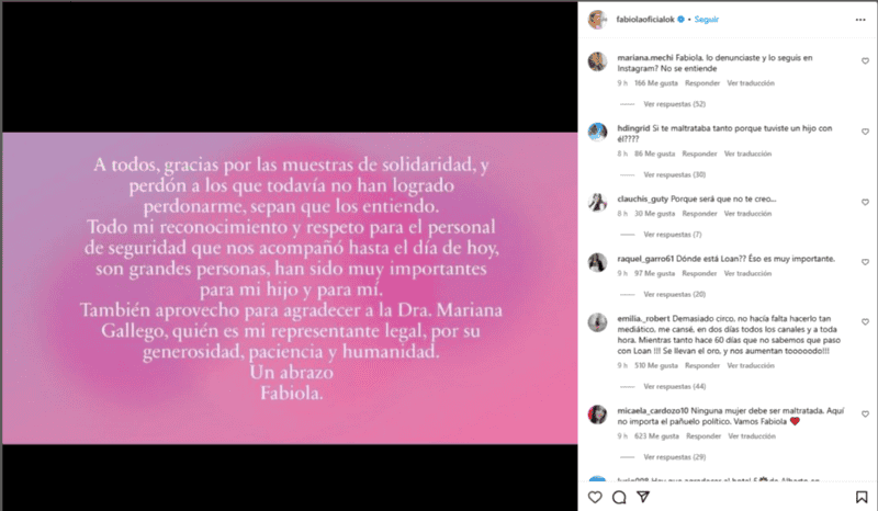Fabiola Yañez, posteó en su cuenta de Instagram un agradecimiento por la solidaridad recibida luego de que denunciara al expresidente de la Nación, Alberto Fernández, por violencia de género.