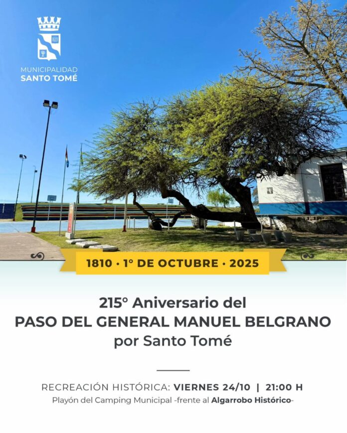 La Municipalidad de Santo Tomé invita a la comunidad a participar de las actividades conmemorativas por el 215° aniversario del paso del General Manuel Belgrano por nuestra ciudad, hecho ocurrido el 1° de octubre de 1810, en el marco de la histórica Campaña al Paraguay.