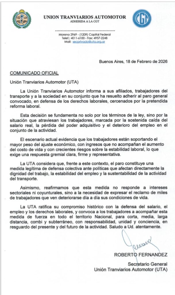 Desde la central sindical cuestionaron el proyecto oficial al considerarlo “inconstitucional” y alertaron sobre la situación sociolaboral. En ese marco, la CGT se solidarizó con los trabajadores de Fate, la histórica empresa de neumáticos que anunció su cierre definitivo y el despido de más de 900 empleados, y lo vinculó con la política económica del Gobierno.