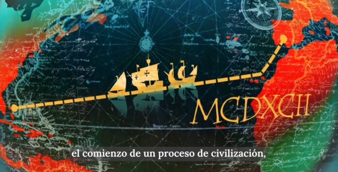 “El 12 de octubre de 1492, Cristóbal Colón llegó a América dando inicio a una de las gestas más trascendentales de la historia: el comienzo de un proceso de civilización, orden y progreso que marcaría para siempre el inicio del continente”, sostiene la voz en off de la pieza audiovisual difundida desde la cuenta de X de Casa Rosada.