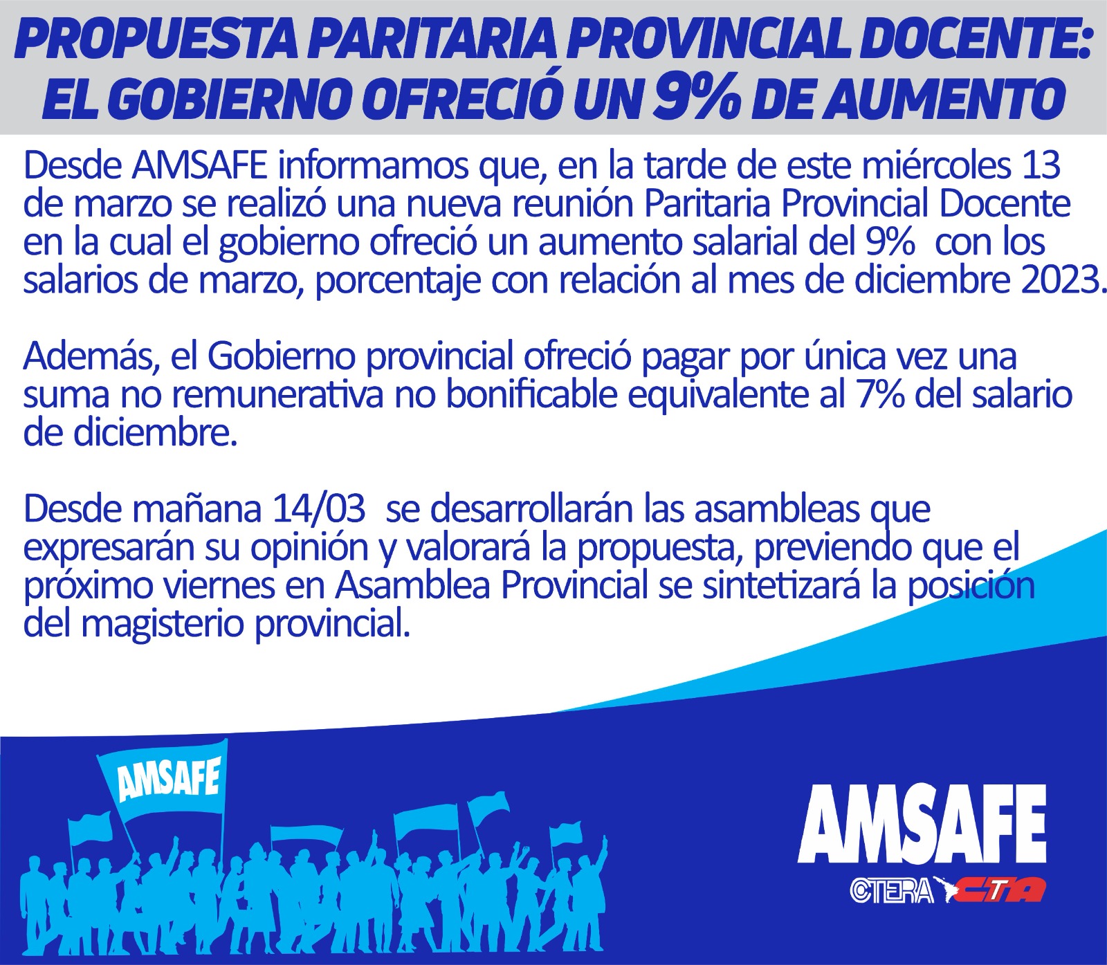 Respecto a la deuda de la paritaria 2023, precisó: «Tenemos que recordar que es el 22,4% y corresponde al mes de enero, proponen abonar un tercio de esa deuda que sería a través de una suma no remunerativa y no bonificable».