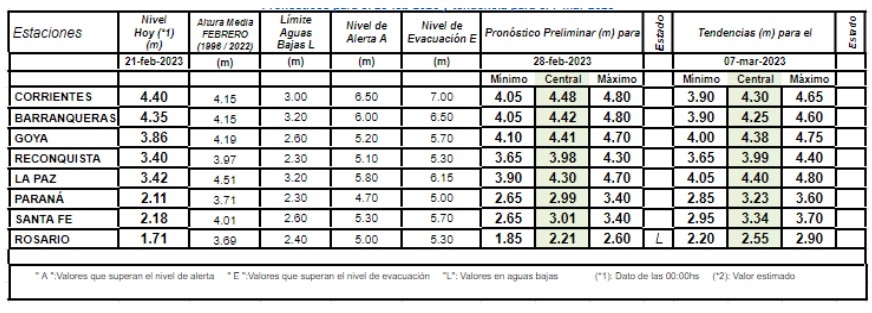 Este martes el INA actualizó su informe semanal en relación a la altura del río Paraná para la región central del país. Para nuestra ciudad las proyecciones indican que para el 28 de febrero se podría llegar a los 3,01 mts (pronostico preeliminar «central»); mientras que para el 7 de marzo llegaría a los 3,34 metros.